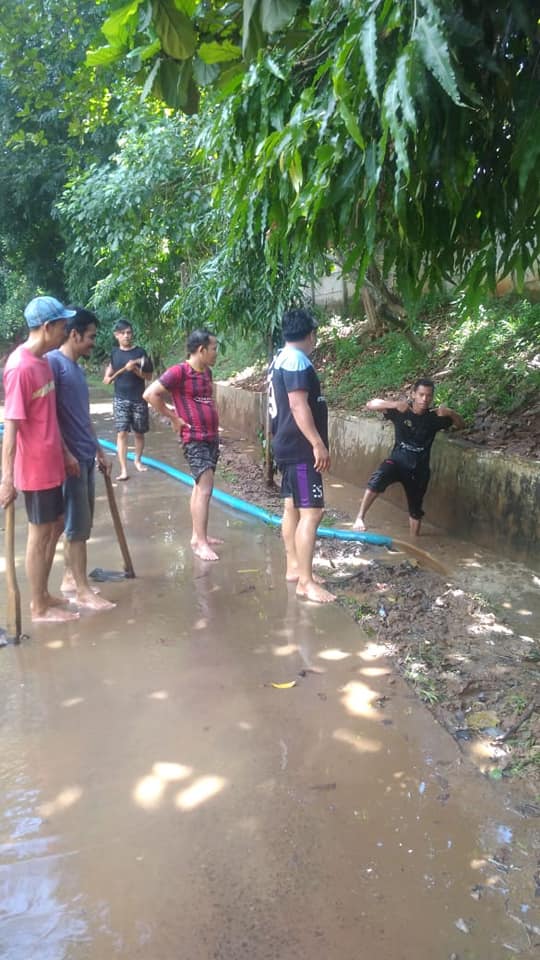 Pembersihan dan penyemprotan lumpur dampak limpahan air sungai Caringin dilakukan dengan penuh semangat oleh karyawan dan relawan sekolah.