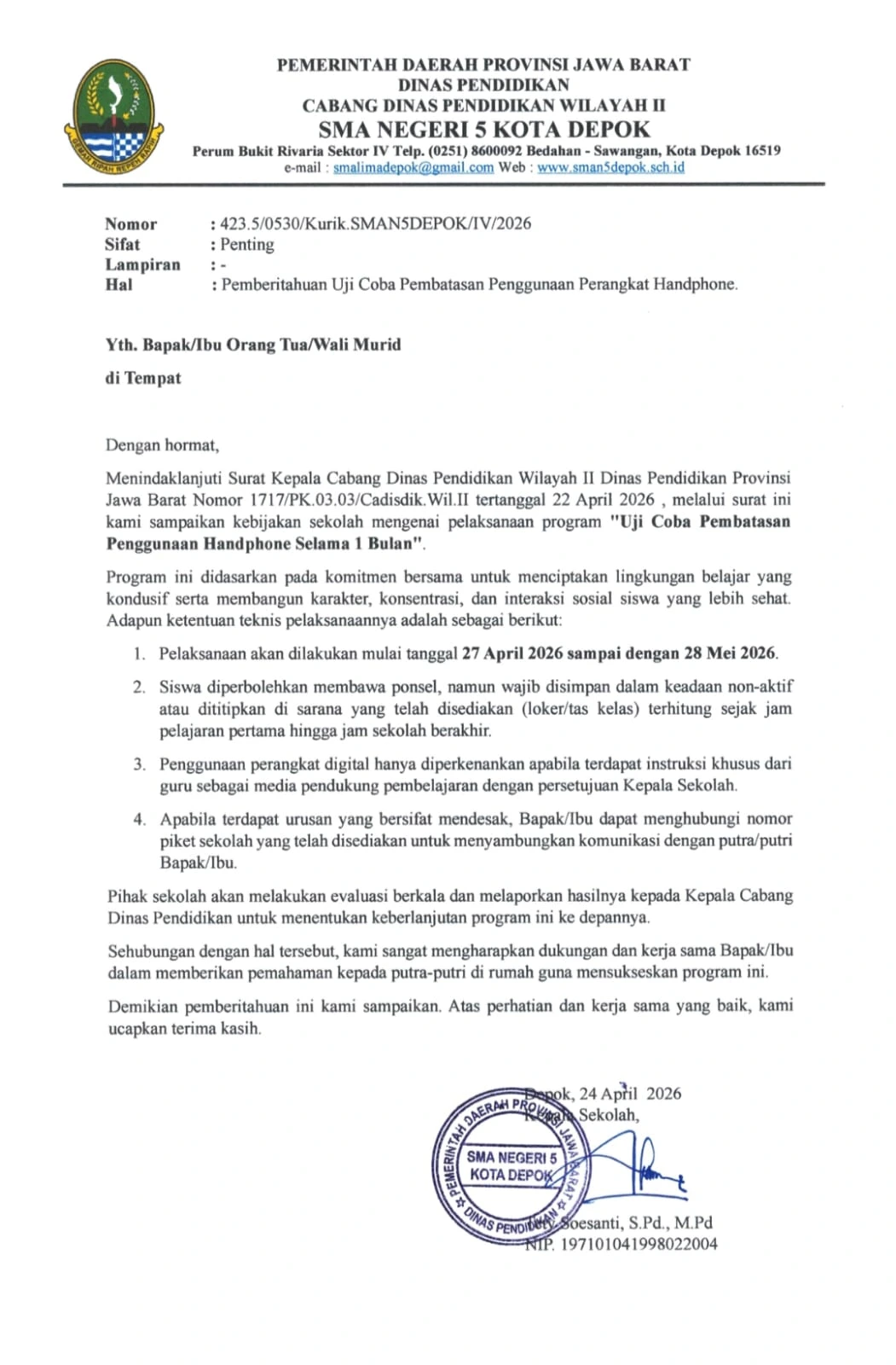 Depok, 27 April 2026 — Dalam rangka meningkatkan kualitas pembelajaran dan kedisiplinan siswa, SMAN 5 Kota Depok menetapkan uji coba kebijakan larangan penggunaan telepon genggam (HP) di lingkungan sekolah terhitung mulai 27 April 2026.